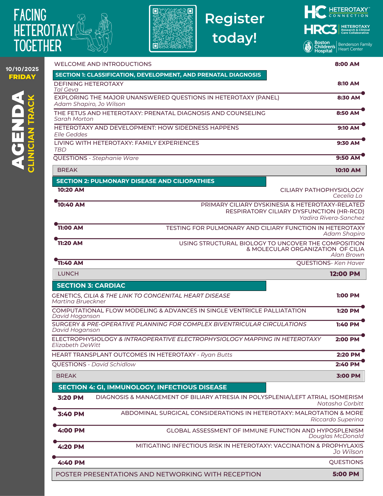 By registering for the scientific conference, you can be part of a unique in-person collaborative event for researchers, clinicians, and families that will aim to improve care, deepen knowledge, and strengthen the heterotaxy community.